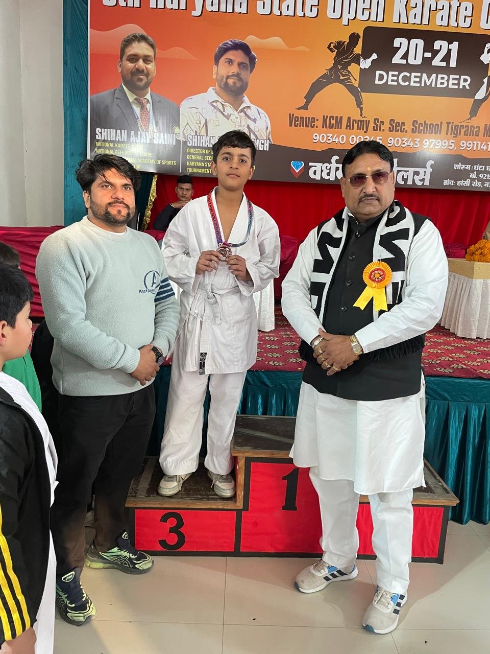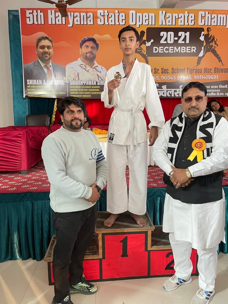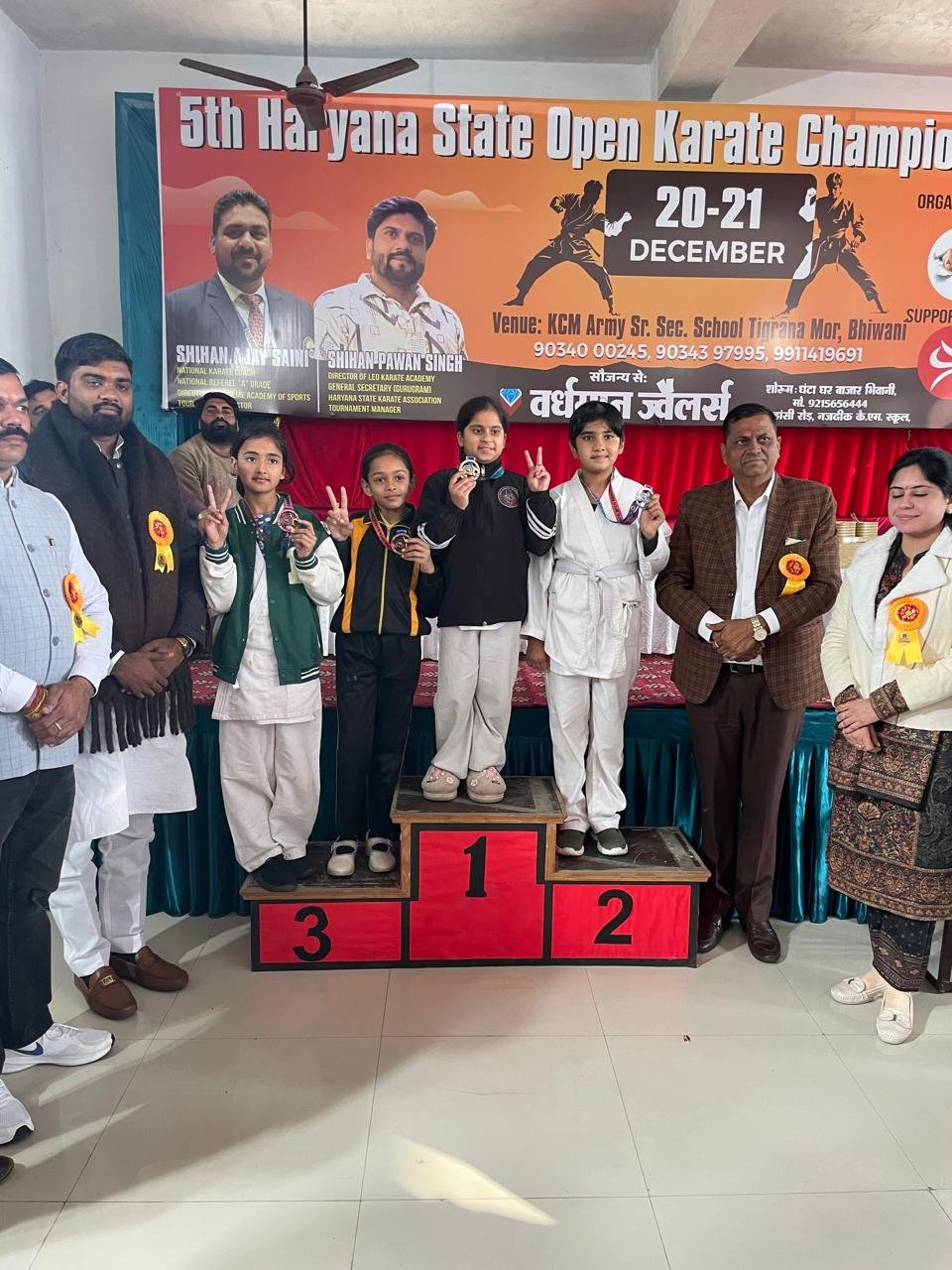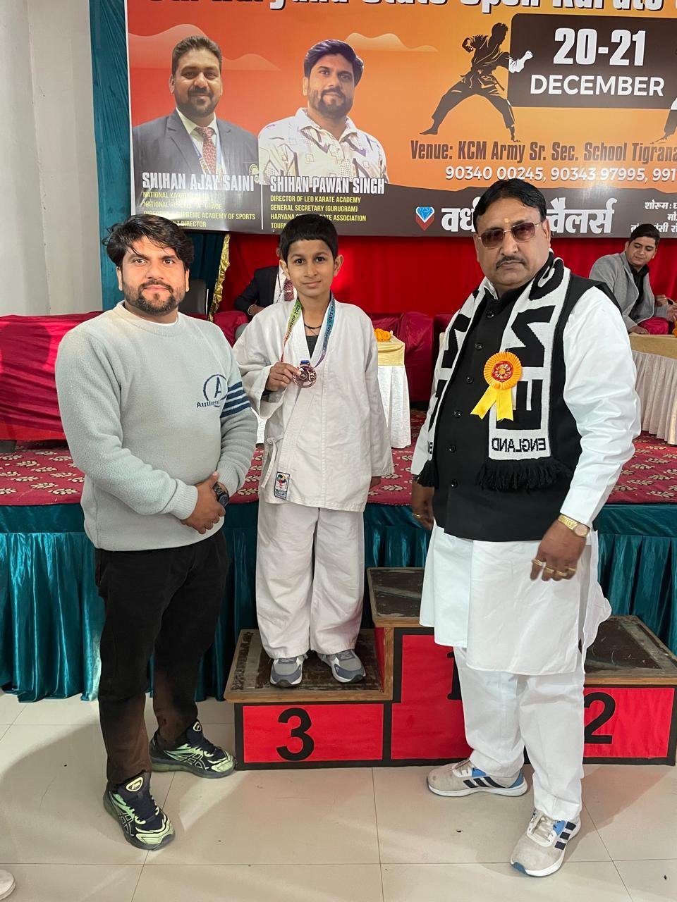 The Fifth Haryana State Open Karate Championship was organized at K.C.M.ARMY High School in Bhiwani on December 20-21, 2025. Around 430 players participated in the event. 18 students from Om International Public School, trained by Karate Coach Vikas Jangra, took part and won 6 Gold, 4 Silver, and 8 Bronze medals.