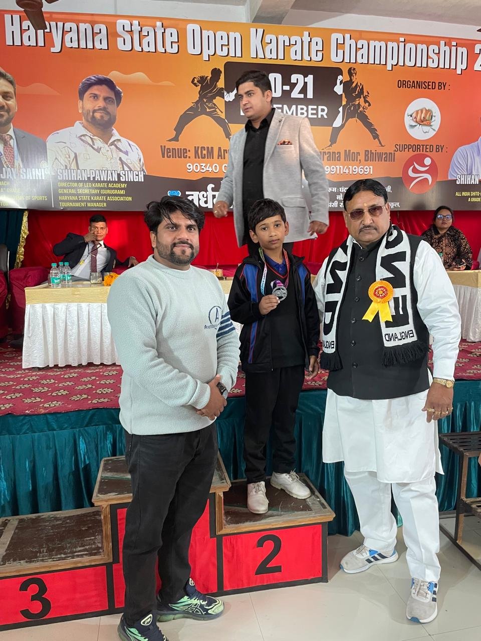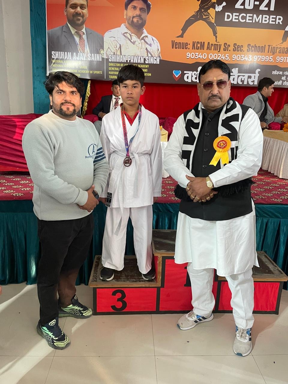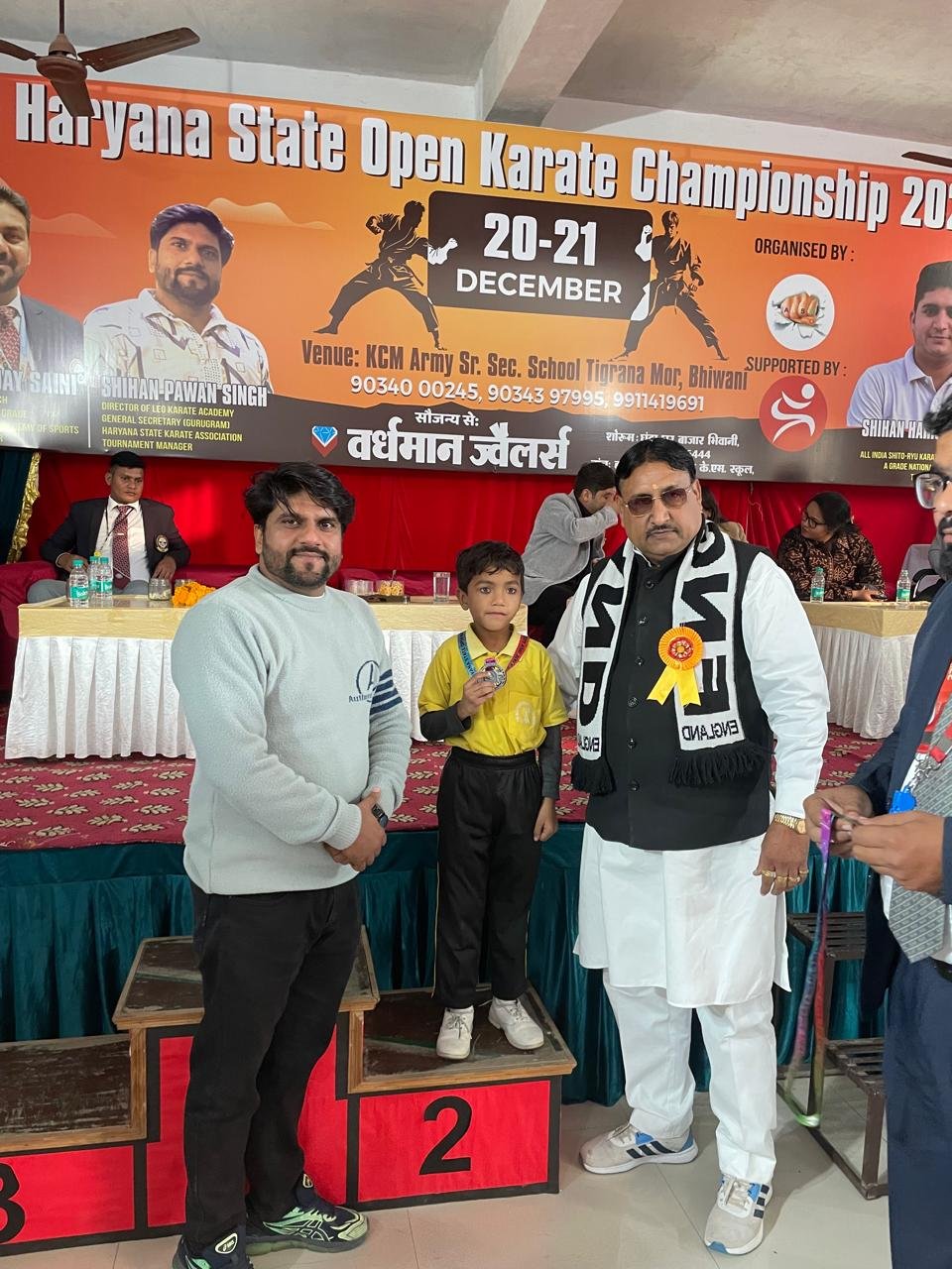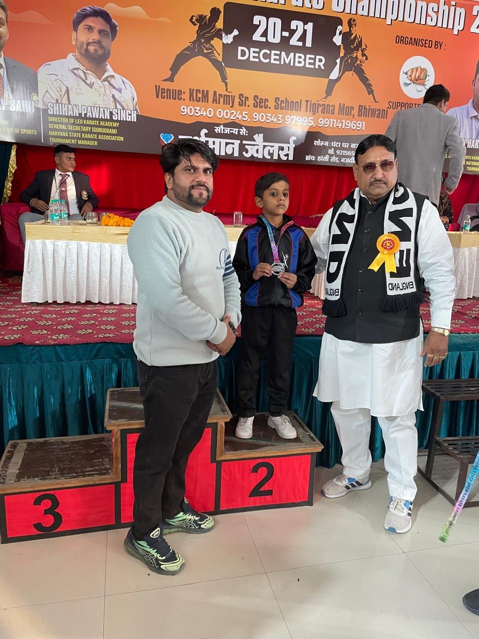 The Fifth Haryana State Open Karate Championship was organized at K.C.M.ARMY High School in Bhiwani on December 20-21, 2025. Around 430 players participated in the event. 18 students from Om International Public School, trained by Karate Coach Vikas Jangra, took part and won 6 Gold, 4 Silver, and 8 Bronze medals.